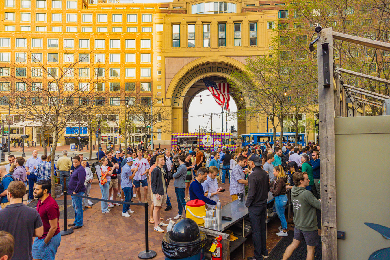 Modern industrial aesthetic taproom nestled downtown near Fenway Park. This location offers an open concept floor plan for the interior taproom, available for both private and semi-private functions of up to 60 guests. With retractable glass walls, this versatile space expands to offer open air accommodations and a wraparound patio for up to 300 guests.